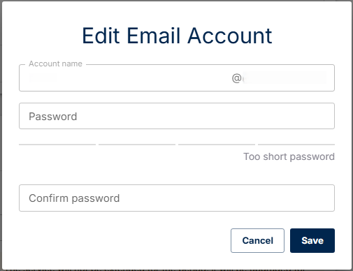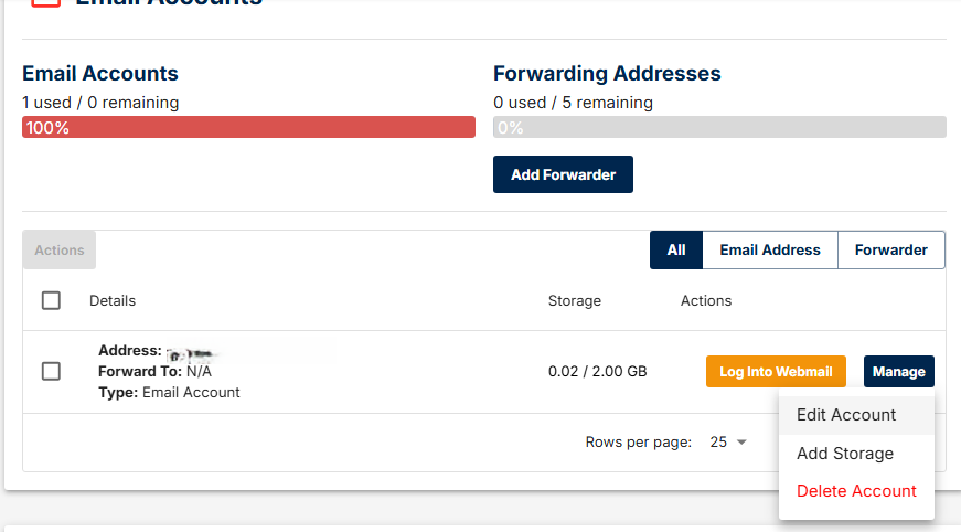 3. On this page, click the 'Manage' button next to the email you wish to change the password for, and then click 'Edit Account':