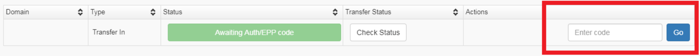 4. Once your order has been processed, you will need to process the EPP/Auth code provided by your former hosting provider. You can do this by clicking the Transfer tab at the top of the page. Then you will need to input the code in the process EPP/Auth code section.